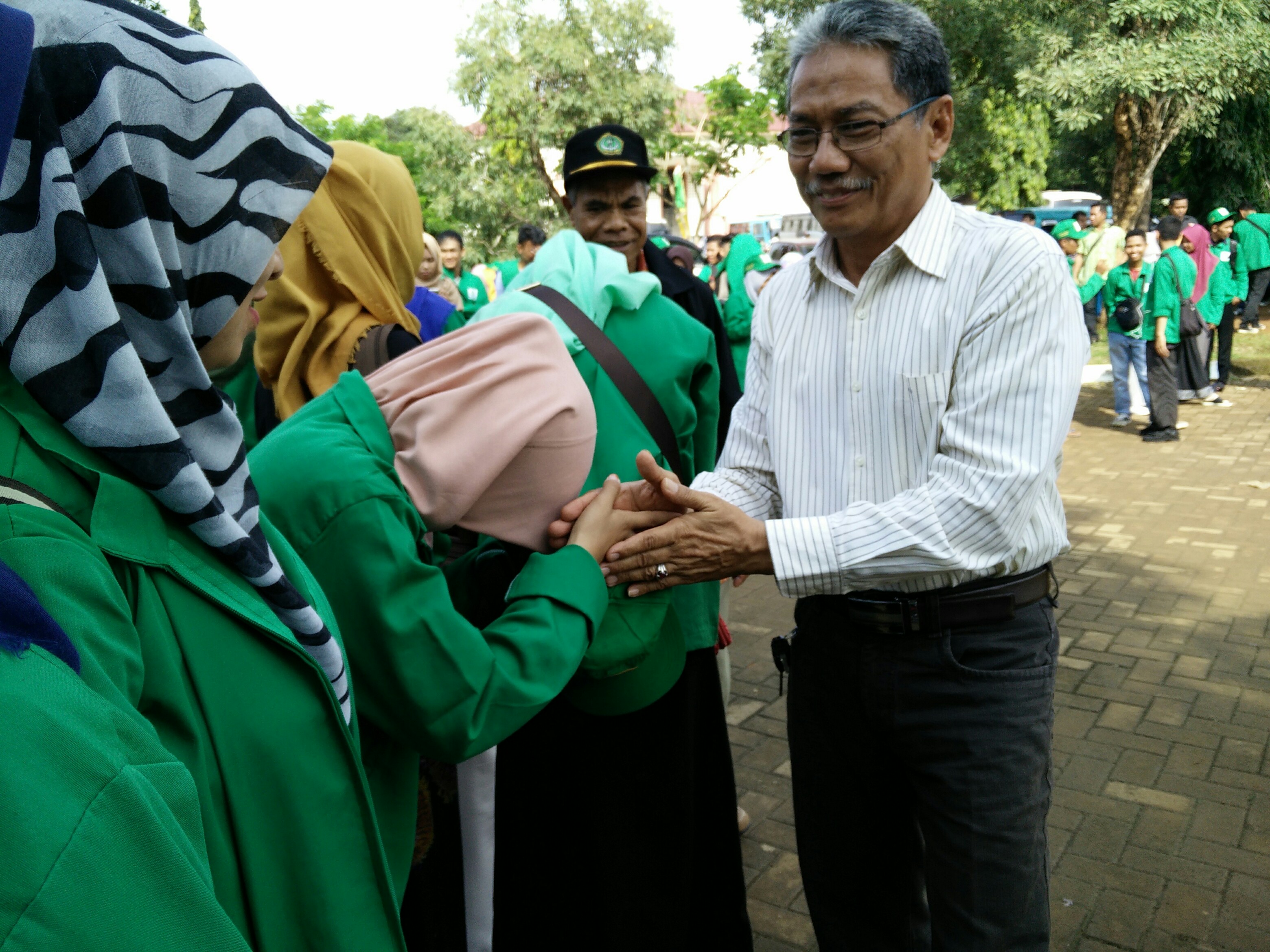 Dr M Gazali Suyuti bersalaman dengan para mahasiswa sebelum di berangkatkan ke lokasi KKN , Jumlah mahasiswa KKN yang berangkat di kecamatan Tombolo Pao sebanyak 115 mahasiswa , kecamatan Parang Loe sebanyak 80 mahasiswa, dan kecamatan Bajeng sebanyak 84 mahasiswa .