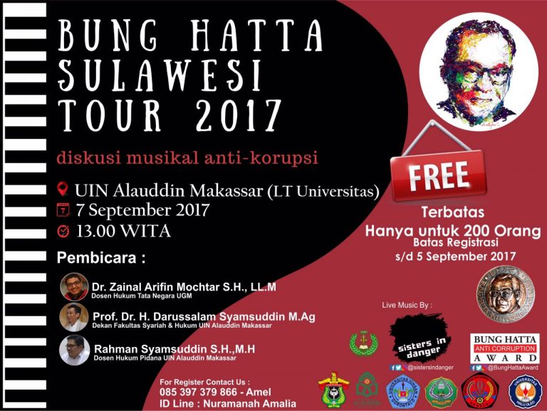 Washilah – Perkumpulan Bung Hatta Anti-Corruption Award (BHACA) akan menyelenggarakan kegiatan Bung Hatta Sulawesi Tour: Diskusi Musikal Anti Korupsi di Lechture Theatre (LT) UIN Alauddin Makassar pada 7 September mendatang.