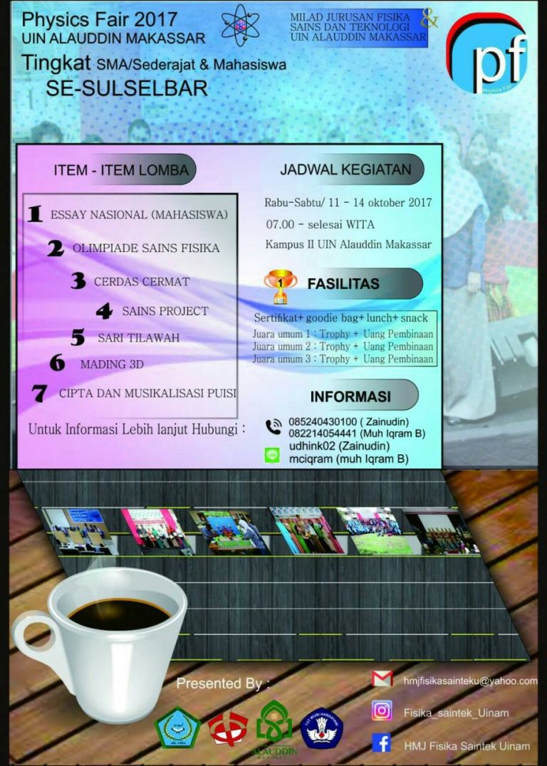 Washilah – Himpunan Mahasiswa Jurusan (HMJ) Fisika Fakultas Sains dan Teknologi (FST) UIN Alauddin Makassar akan menggelar Olimpiade Physics Fair yang akan digelar pada tanggal (11-14/10/2017) mendatang di Kampus II UIN Alauddin Makassar.