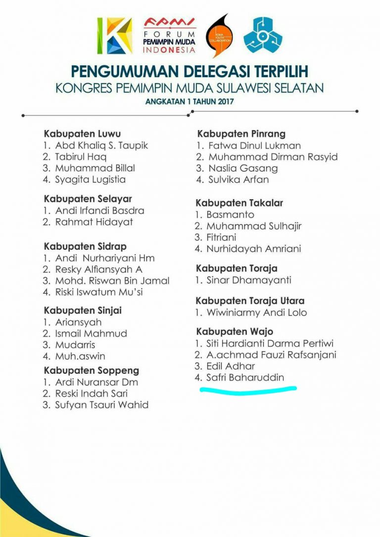 Hasil pengumuman seleksi tahap awal Pemimpin Muda Sulawesi Selatan.