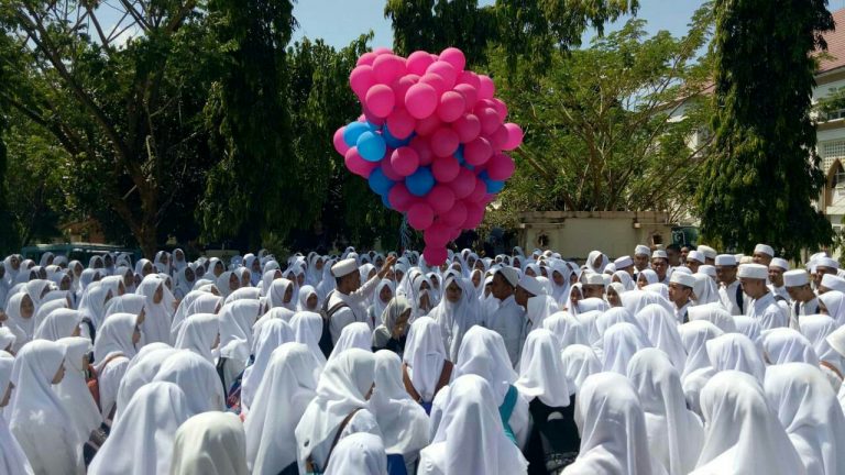 Washilah – Mahasiswa baru Fakultas Kedokteran dan Ilmu Kesehatan (FKIK) menerbangkan ratusan balon yang bertuliskan harapan mereka pada Pengenalan Budaya Akademik dan Kemahasiswaan (PBAK) tingkat fakultas di Pelataran Lecture Theater (LT) Universitas. Rabu (06/09/2017).