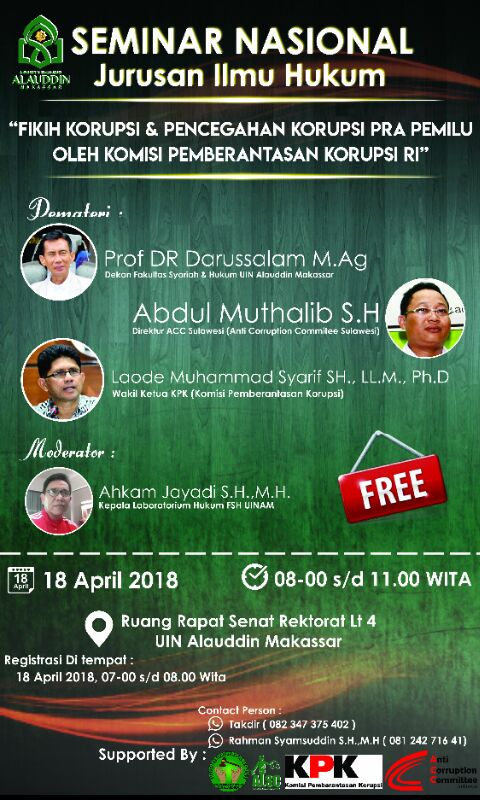 Washilah – Jurusan Ilmu Hukum Fakultas Syariah dan Hukum (FSH) UIN Alauddin Makassar bekerja sama dengan Komisi Pemberantasan Korupsi (KPK) Republik Indonesia (RI) akan mengadakan seminar nasional dengan tema “Fikih Korupsi dan Pencegahan Korupsi Pra Pemilu oleh Komisi Pemberantasan Korupsi RI” di Ruang Rapat Senat Rektorat Lt. 4 pada Rabu, 18 April mendatang.