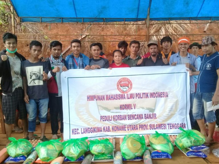Washilah – Pengurus Himpunan Mahasiswa Ilmu Politik Indonesia (Himapolindo) Kordinator Wilayah (Korwil) V se-Sulawesi memberikan bantuan untuk korban banjir di Kecamatan Langgikima Kabupaten Konawe Utara Provinsi Sulawesi Tenggara. Rabu (30/5/2018)