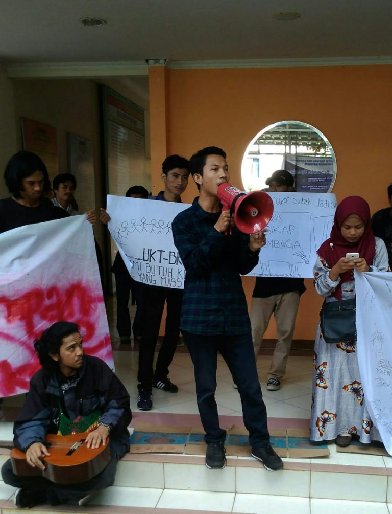 Ketua DEMA FDK Muh Junaidi, orasi berharap revisi kategori bisa tembus supaya sistem UKT BKT subsidi silang ini tepat sasaran, FDK Rabu 04/07/2018.