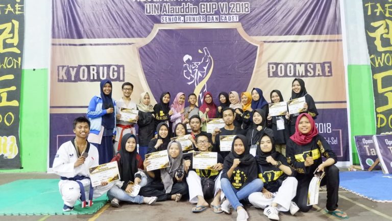 Foto bersama para atlet taekwondo UIN Alauddin Makassar foto usai menerima medali dan sertifikat dalam open tournament UIN Cup VI 2018. Minggu (28/10/2018)