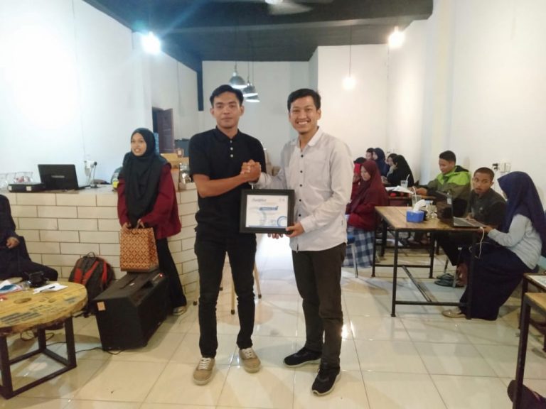 Ketua Unit Kegiatan Mahasiswa (UKM) Riset Keilmuan dan Kemitraan Masyarakat (RITMA) memberi cendera mata kepada pembicara Rahman (Kiri) pada dialog bertajuk "Tradisi Tabayun dalam Menghadapi Isu-isu Politik," di Warkop Dialektika depan kampus II UIN Alauddin Makassar. Selasa (15 /01/2019)