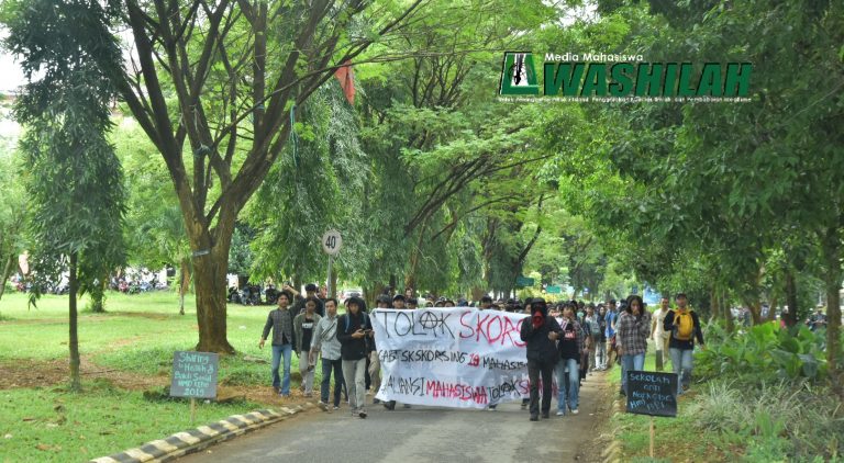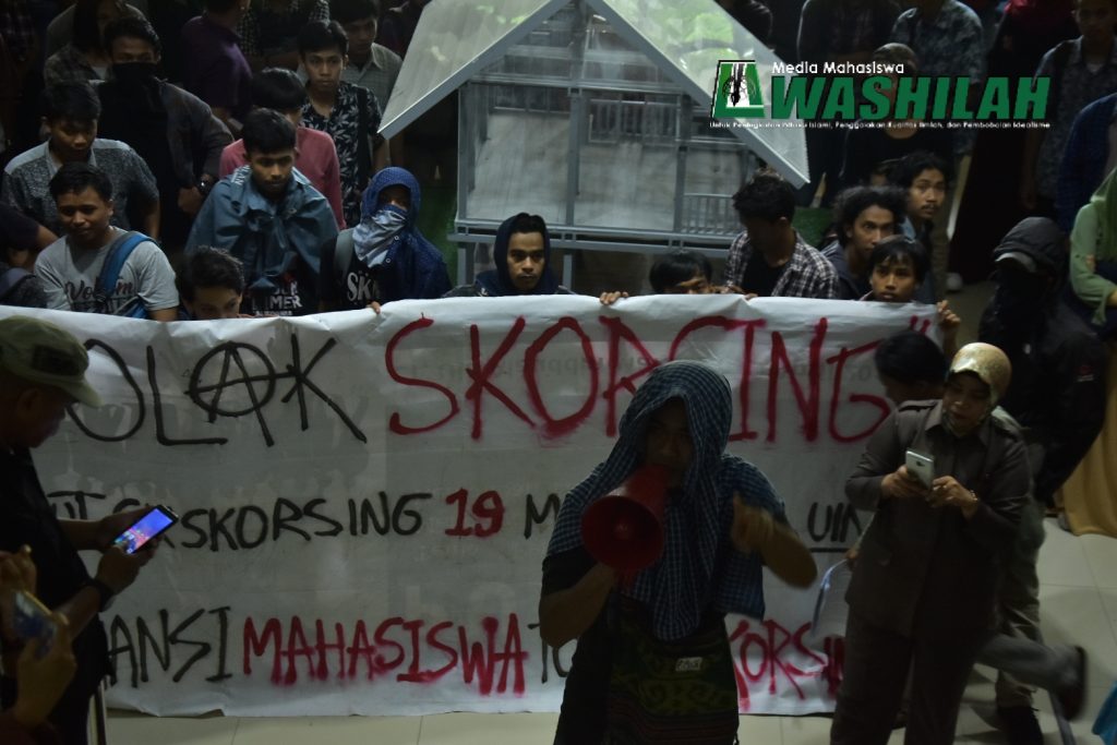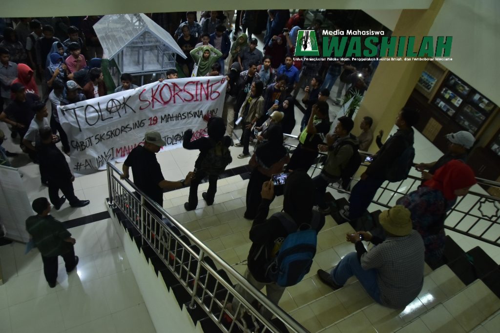 Puluhan mahasiswa UIN Alauddin Makassar yang tergabung dalam aksi tolak skorsing terhadap sejumlah mahasiswa Fakultas Syariah dan Hukum serta Fakultas Dakwah dan Komunikasi. Berjalan kaki menuju rektorat untuk menyampaikan tuntutan atau klarifikasi terhadap keputusan sepihak yang dilakukan pihak birokrasi UIN Alauddin Makassar. Selasa ( 23/04/2019).