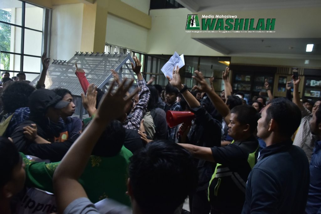 Puluhan demonstrasi memaksa masuk kedalam ruang rektorat untuk dapat secara lansung menyampaikan orasi di depan para pimpinan birokrasi UIN Alauddin Makassar.