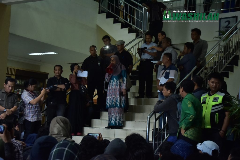 Prof Dr Siti Aisyah Kara menanggapi peserta demontrasi mengenai pencabutan SK Skorsing, menurutnya proses dalam penetapan SK Skorsing merupakan aturan dari rapat komdis, penetapan sudah dilakukan dengan bukti-bukti yang ada di lapangan, ia mengharapkan kepada Mahasiswa agar membangun hubungan kepada birokrasi dengan melakukan prosedur persuratan ke rektorat.