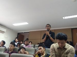 Salah satu mahasiswa dari jurusan Studi Agama-Agama (SAA), Iqbal Muhammad, memberikan pertanyaan kepada pembicara Launching Buku “Perempuan Perspektif Tasawuf”, bertempat di Lecture Theater (LT) Fakultas Ushuluddin, Filsafat, dan Politik (FUFP), Senin (9/12/2019)