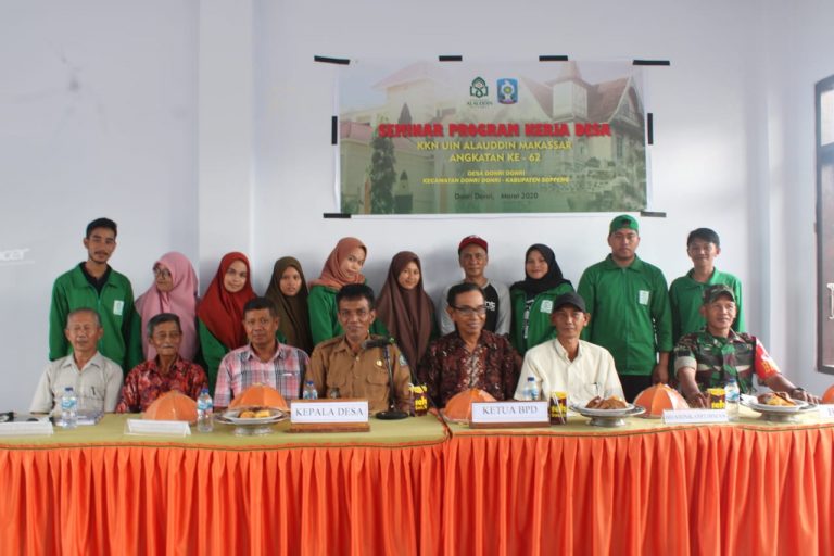 Washilah – Mahasiswa Kuliah Kerja Nyata (KKN) Universitas Islam Negeri (UIN) Alauddin Makassar Angkatan 62 mengadakan Kegiatan Seminar Program Kerja (Proker) di Aula Desa Donri-Donri, Kecamatan Donri-Donri, Kabupaten Soppeng, Selasa (10/3/2020).