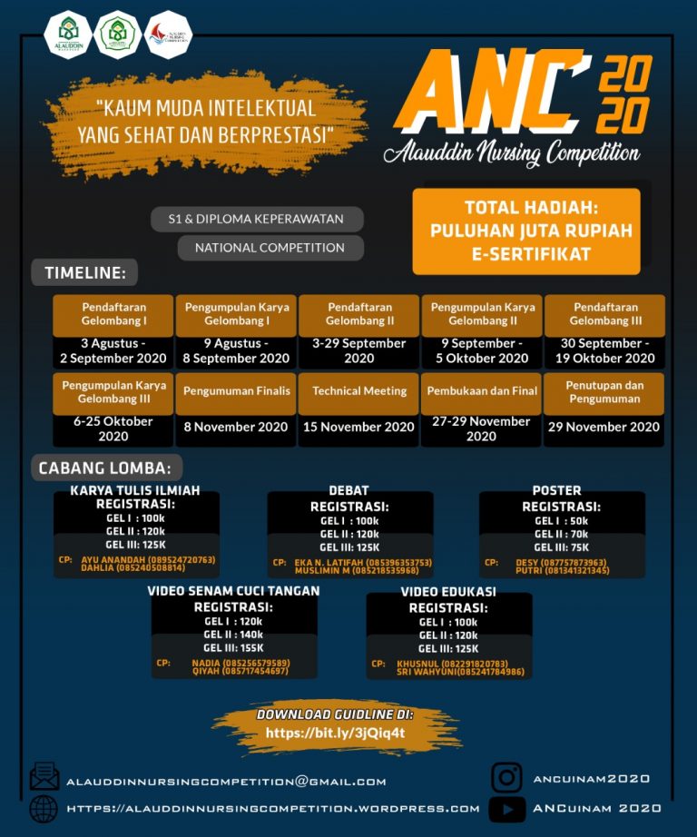 Washilah – Himpunan Mahasiswa Jurusan (HMJ) Keperawatan UIN Alauddin Makassar menggelar lomba Alauddin Nursing Competition (ANC) yang pertama kalinya dengan mengusung tema “Kaum Muda Intelektual yang Sehat dan Berprestasi”, dilaksanakan pada tanggal 27 – 29 November 2020, Rabu (5/8/2020).