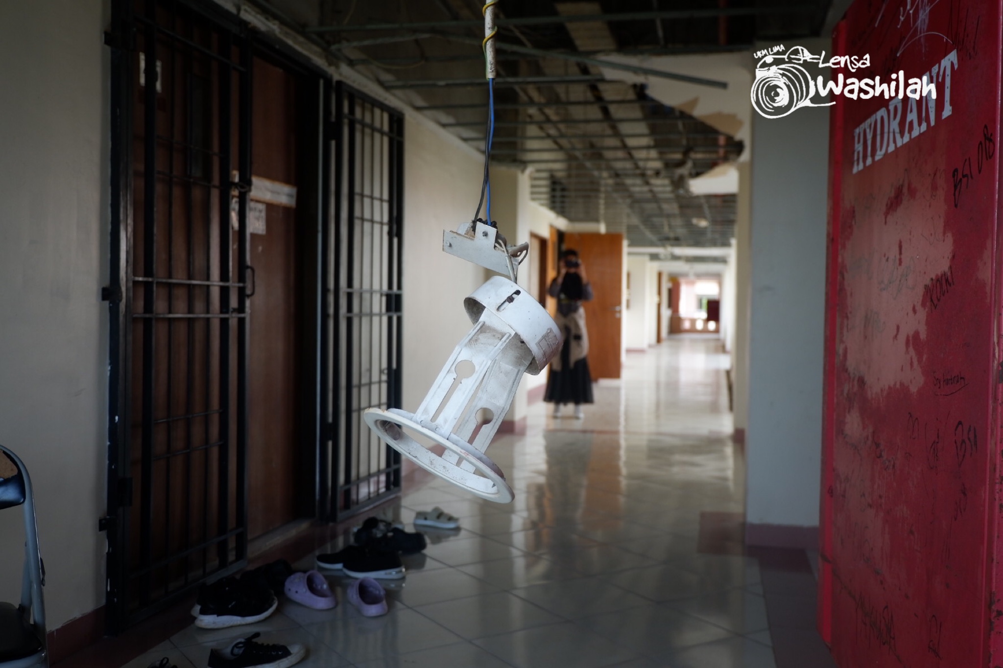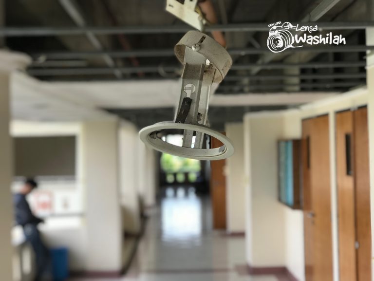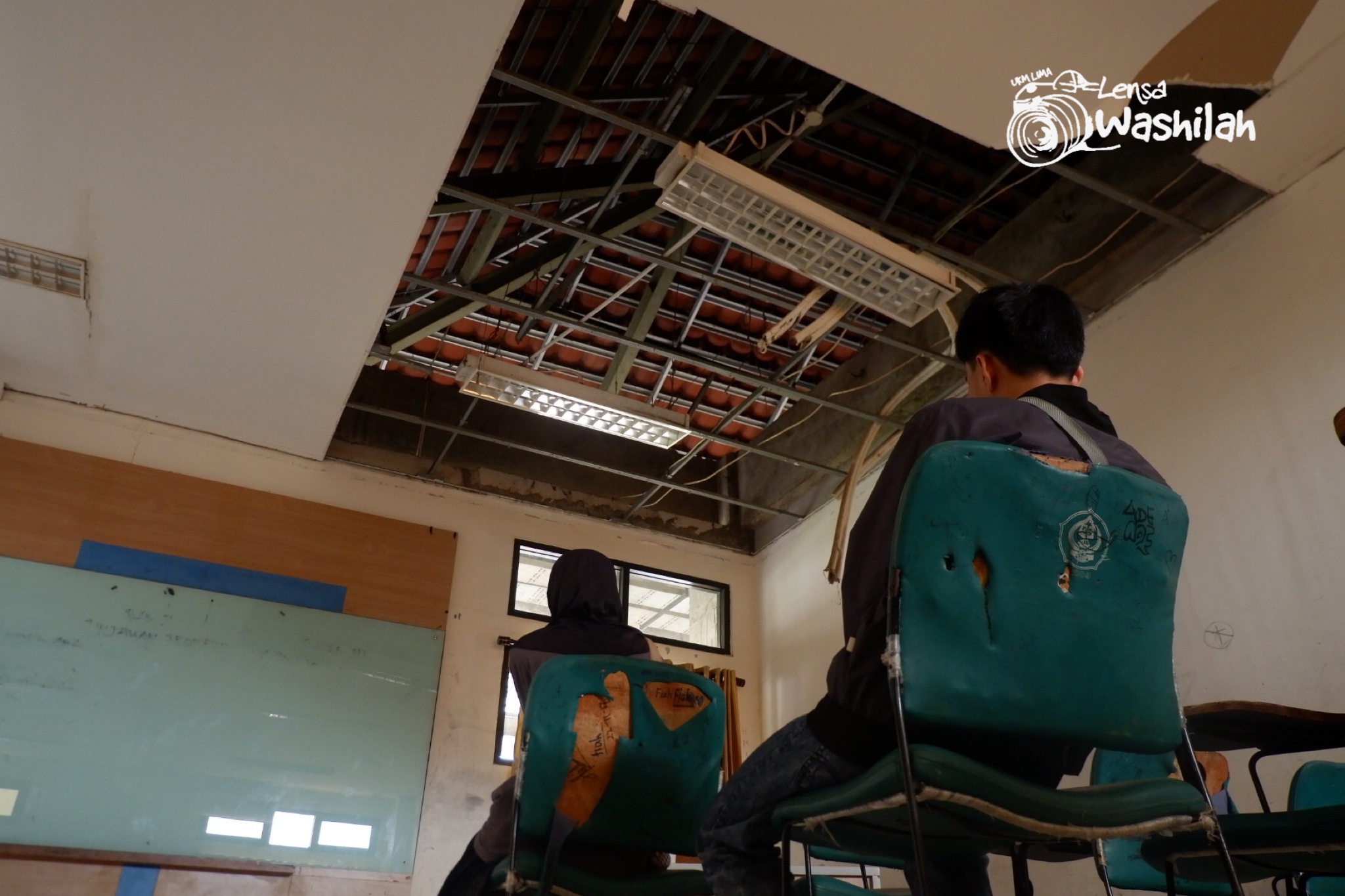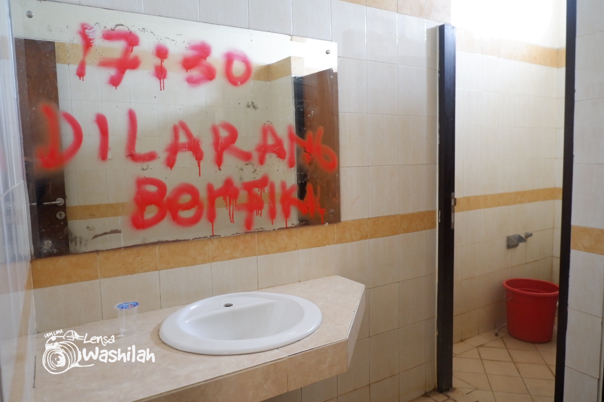 Selain plafon yang rusak parah, water closet (wc) nampak tidak terawat dan menjadi gudang penyimpanan dan vandalisme di cermin yang bertuliskan “17:30 Dilarang Berisik”.