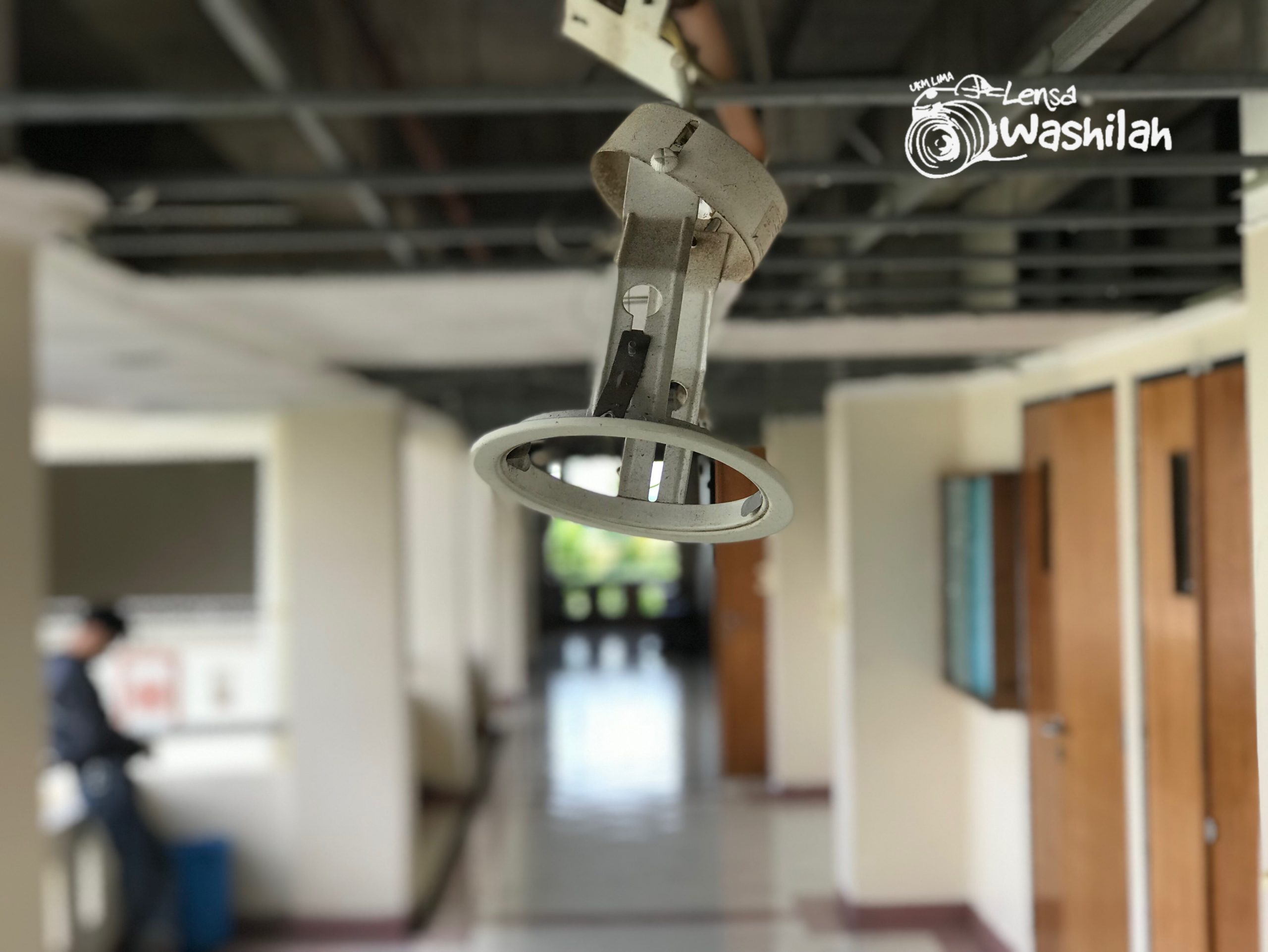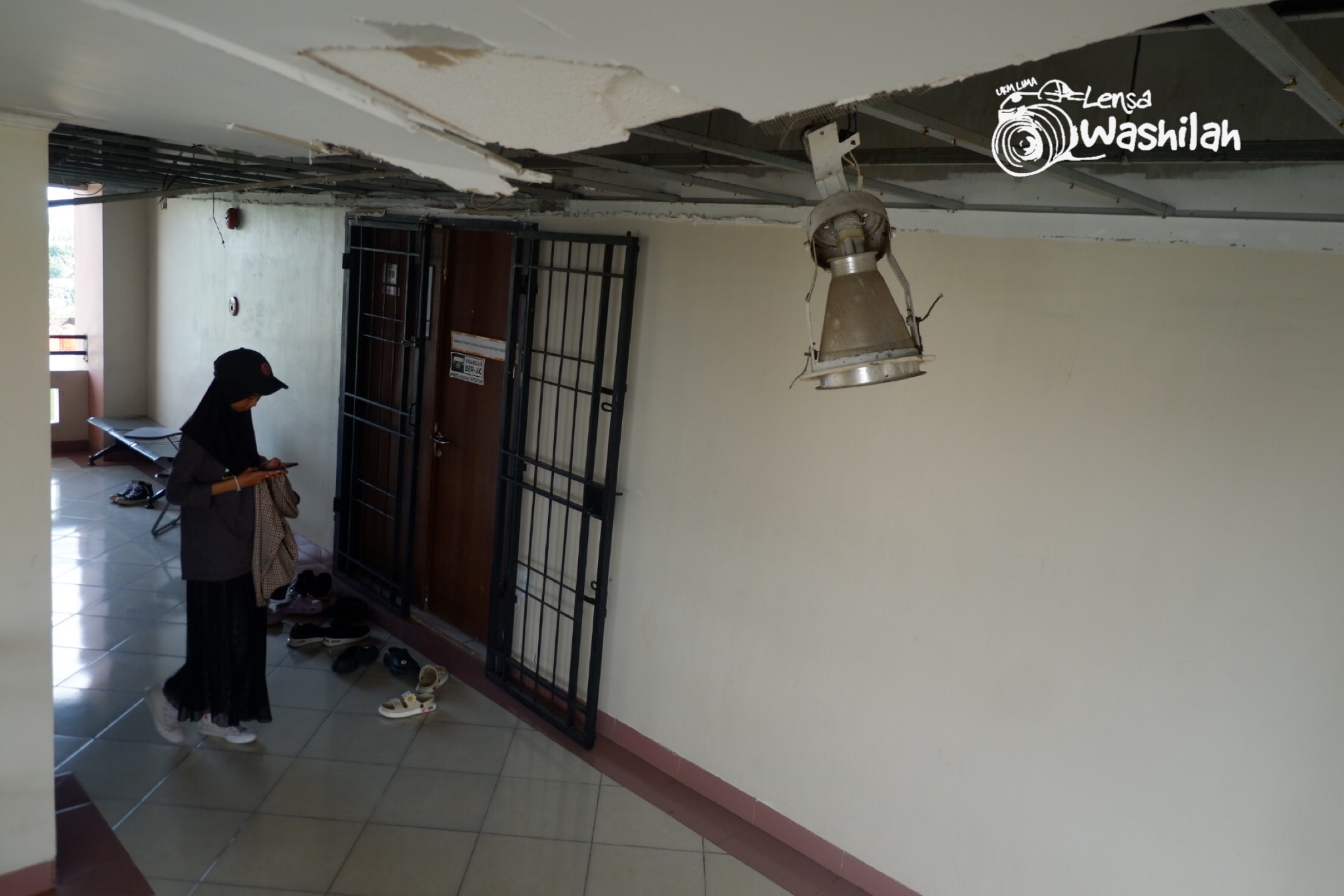 Plafon di depan Laboratorium Sejarah, Kebudayaan dan Dokumentasi yang sudah rubuh dan lampu yang meggantung karena rusak.