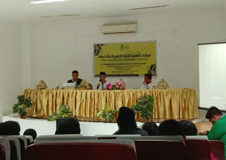 Washilah – Himpunan Mahasiswa Jurusan (HMJ) Bahasa dan Sastra Arab (BSA) Fakultas Adab dan Humaniora (FAH) UIN Alauddin gelar dialog dan penutupan milad ke-56 jurusan BSA dengan tema “Berbaur dengan Bahasa, Berkarya dengan Sastra” yang berlangsung di Lecture Theater (LT) FAH, Senin (27/11/2023).