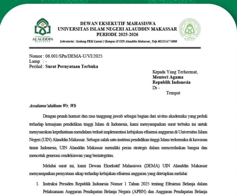 Washilah — Dewan Eksekutif Mahasiswa (DEMA) UIN Alauddin Makassar melayangkan surat pernyataan terbuka kepada Menteri Agama Republik Indonesia pada 6 Juni lalu. Surat tersebut berisi kritik dan tuntutan terkait kebijakan efisiensi anggaran yang dianggap telah menimbulkan dampak serius di lingkungan kampus, Senin (9/6/2025).