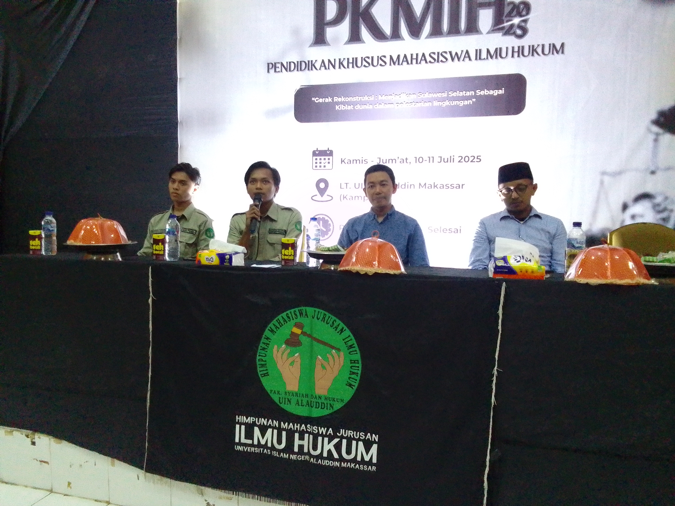 Washilah — Himpunan Mahasiswa Jurusan (HMJ) Ilmu Hukum (IH) Fakultas Syariah dan Hukum (FSH) UIN Alauddin Makassar menggelar Pendidikan Khusus Mahasiswa Ilmu Hukum (PKMIH) bertajuk “Gerak Rekontruksi: Menjadi Sulawesi Selatan sebagai Kiblat Dunia dalam Pelestarian Lingkungan” di Lecture Theater (LT) Universitas, Kampus II UIN Alauddin, Kamis (10/7/2025).