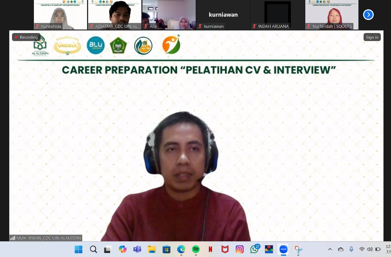 Washilah — Career Development Center (CDC) UIN Alauddin Makassar menggelar webinar Pelatihan Interview dan Pembuatan CV, yang diikuti oleh mahasiswa dan alumni UIN Alauddin Makassar, melalui aplikasi zoom, Rabu (9/7/2025).
