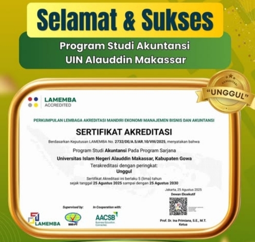 Washilah — Jurusan Akuntansi Fakultas Ekonomi dan Bisnis Islam (FEBI) UIN Alauddin Makassar raih akreditasi unggul yang tercantum dalam keputusan Lembaga Akreditasi Mandiri Ekonomi Manajemen Bisnis dan Akuntansi (LAMEMBA) Nomor 2732/DE/A.5/AR.10/VIII/2025.